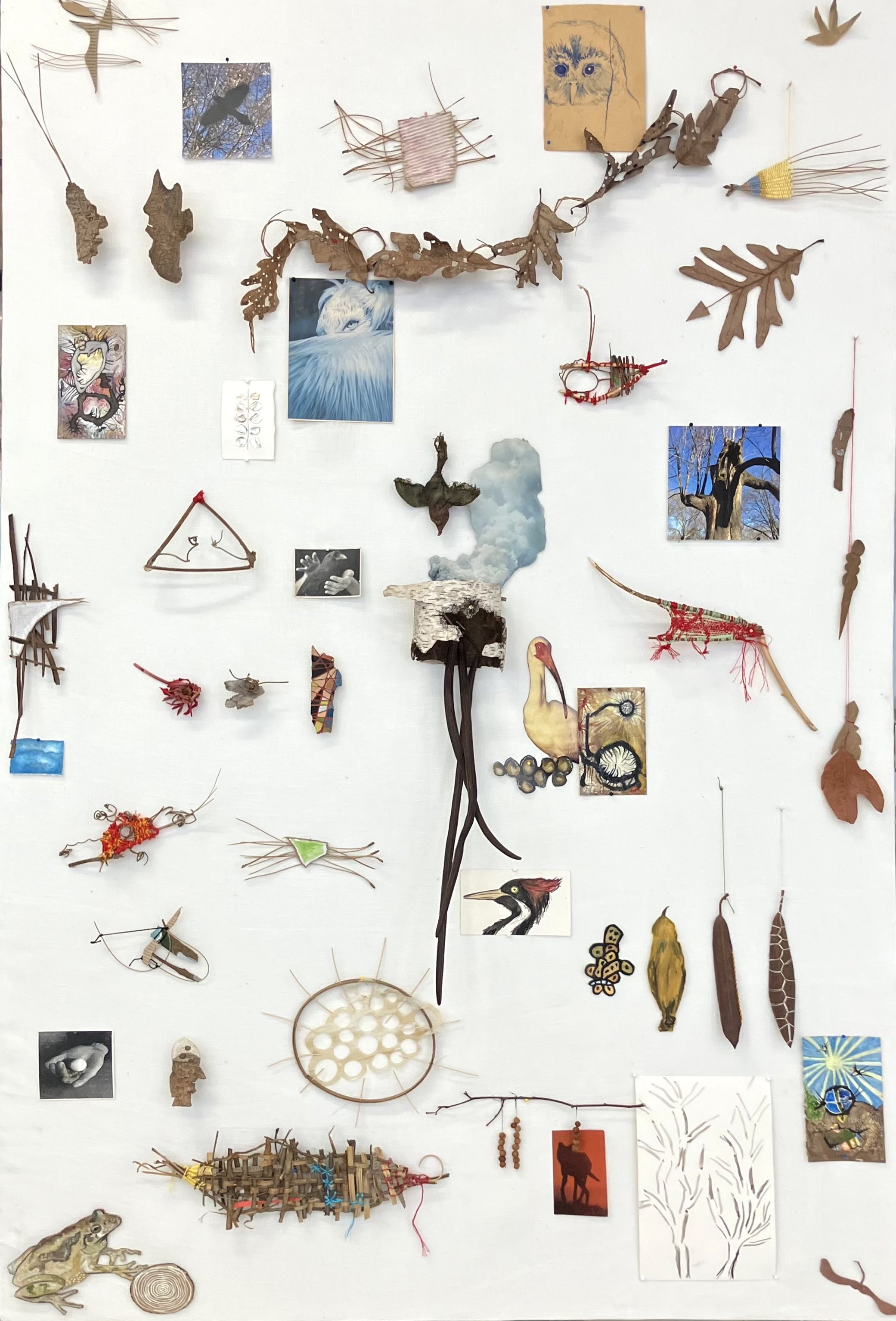 Alice Momm is an urban artist whose practice grows from her longing to reconnect with the more than-human living world. Materials are met on walks: with picked-up things, written thoughts, snapped photos. Momm is drawn to the tension of working with fragile materials to bring them into the sphere of art. The collections in her studio are sewn, cut, woven, painted, collaged and photographed as she connects with the "beingness" of each thing. Faces emerge from bark shards, weavings are created from studio scraps, a flock of birds grows from old coffee cup sleeves, worlds are born and changed. Outdoors, Momm creates large environmental sculptures and performative collaborations. "Interlude for Millay," her evolving large-scale piece, incorporates a meadow, gleaned and sown plants, and Momm in the middle weaving it all together, responding to growth, decay, shifting light and changing seasons. All Momm's works encourage a deeper connection with the natural world. It is how she meets climate grief with love.