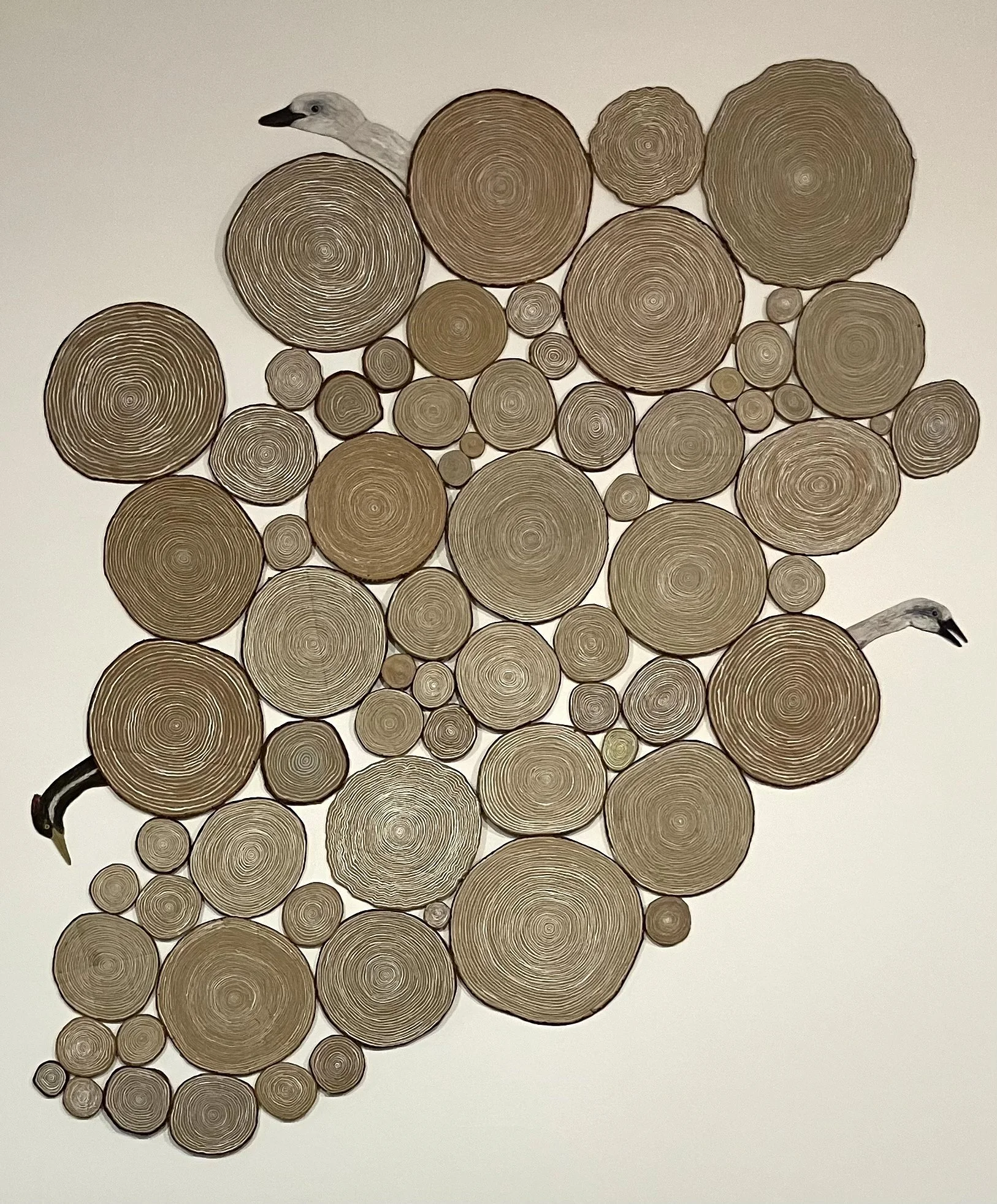 Séance is made from old cardboard boxes and scraps. It is configured differently each time it is shown as the piece continues to evolve. Making the piece grows from the studio ritual of centering myself by painting concentric circles on a scrap of cardboard until I hit the edge of the sheet and then I cut the shape out so that it resembles a cross-section of a tree ring.In this time of mail-order everything with its promise of instant gratification, cardboard spills out everywhere. My use of it is a deliberate choice to do my small part to staunch the flow and turnby-product into art. Séance is also my attempt to call forth cardboard’s origin as a tree. The bird heads also wanted to be called forth and remembered.