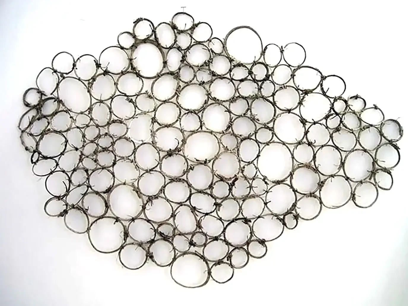 The kudzu vine was imported from Japan in the 1950s and widely planted along highways in an attempt to prevent erosion. It grew so well that it quickly took over vast swaths of the southern landscape, covering all in its path – houses, trees, roads... I decided to work with kudzu, a material both maligned and plentiful, while on a residency in the Blue Ridge Mountains of Georgia. I struggled with the vines – an uncomfortable balance of working intuitively and being thwarted at every turn trying first to fashion the vines into a swing (daily rains dampened that plan) then a shelter. Finally, I decided to wear my struggles and refigured the woven vines into a dress. Thus robed, and with a kudzu crown, I became the Exiled Queen of Kudzu, unwanted and uncomfortable, and toured the grounds of Hambidge before casting the dress off into the woods. Kudzu cells, featured here, is the one piece saved from that experience.