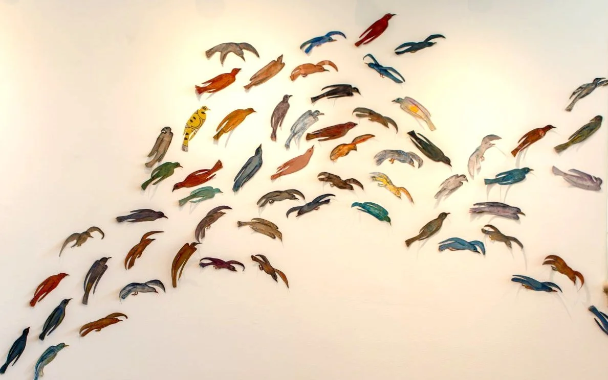 These birds are made from coffee cup sleeves. I started collecting them in the pandemic when I was no longer able to bring my own coffee mug to the localcafé to fill. The sleeves started accumulating and I turned them into a flock of birds.