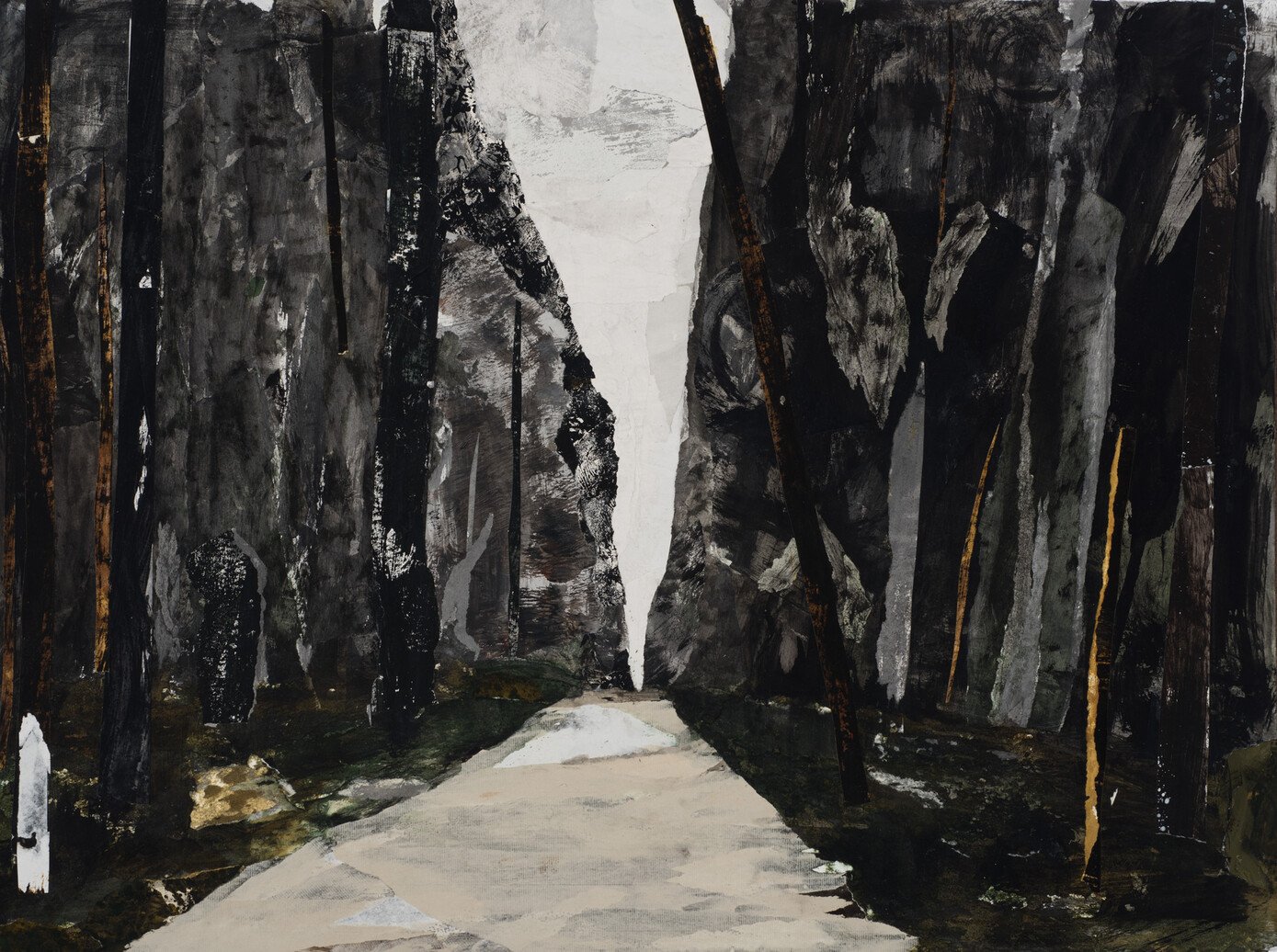 Thick oil paint and torn, jagged shards of paper exhilarate me as they interact, coming together in ways that often surprise me. I find change exciting, and tend to constantly re-work pieces, causing them to have layered intensity. I'm always interested in process, how a work evolves, and value work that shows the the pentimenti and history of its coming into being.