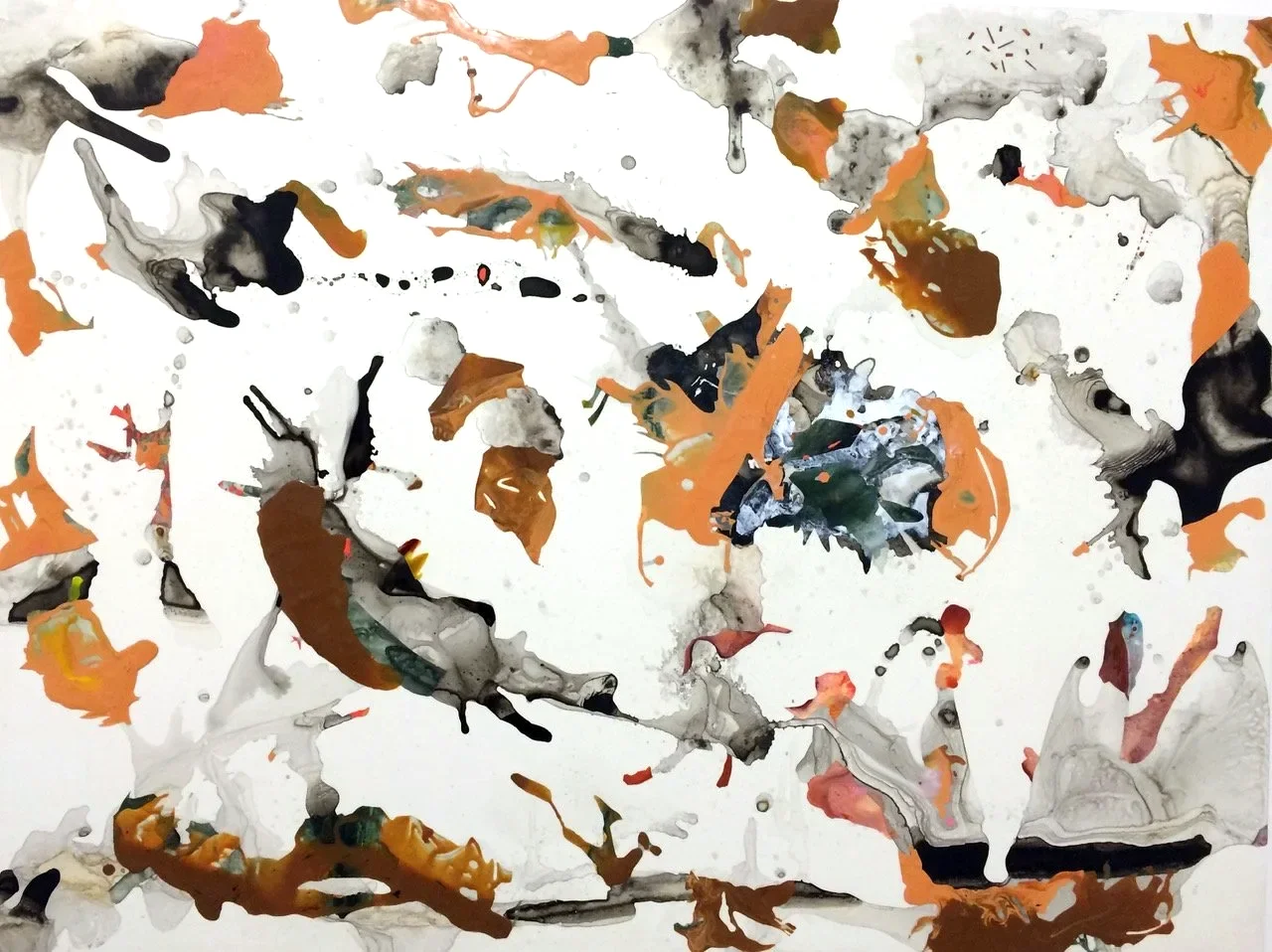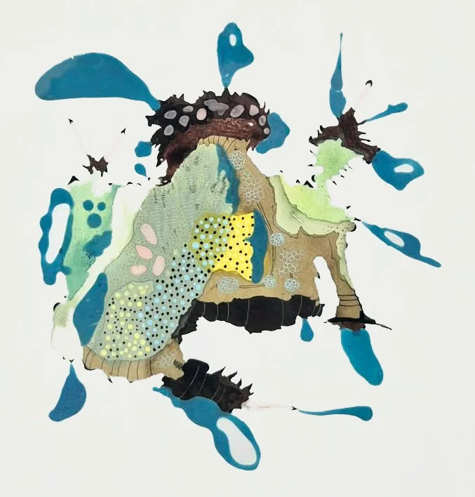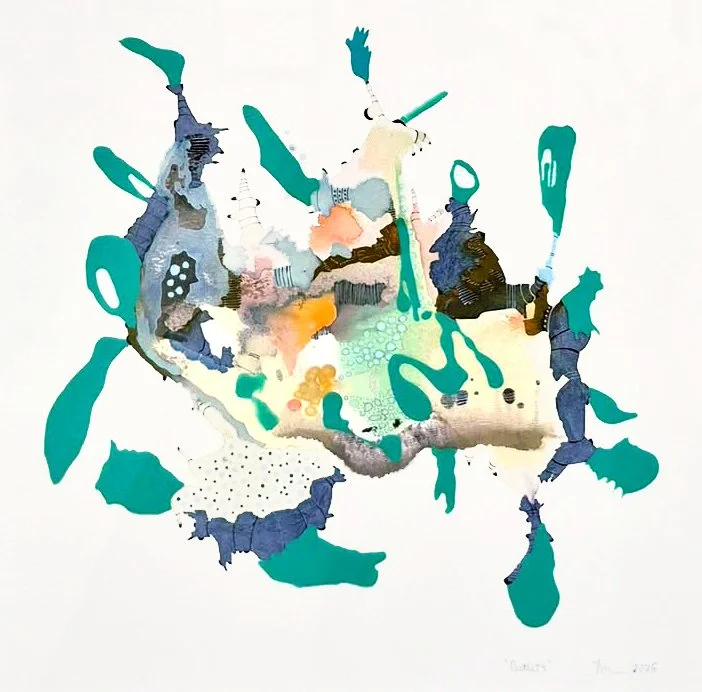 My work is an abstract representation that speaks about my overwhelming concern with our food, water, and air and the effect it has on our bodies, and environment. I like to describe it as abstract hinging on nature. I look to the natural world for inspiration: Invented hybrid forms that suggest disturbed organic creature like beings trying to survive in an environment that remains indefinable, weaving and shifting between whole and part, questioning and challenging our perception. The layering process starts with a spontaneous random gesture of a pour which then becomes more controlled as the piece is developed. Areas in the work remind us of machinery, connecting organs, pipes, roots, stems, pod like areas that mimic the flow inside the body along with the idea of the pod: a protective compartment where organisms can grow and shift. Obsessive movements, small details, compelling use of color, texture, along with biomorphic shapes push the 2-dimensional into appearing 3-dimensional. Looking to the natural world for inspiration: encounters, altered elements, fluids, solidified capsules, and evaporations. The work relays my trepidation about issues of nature, the environment and the fate of humanity and speaks of a complex understanding of the world in which we live and the one towards which we are heading.